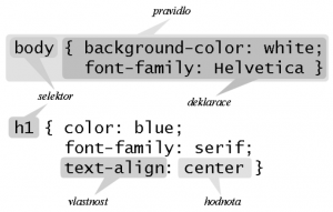 Selektor určuje elementy, na ktoré bude deklarácia aplikovaná. Každá deklarácia sa skladá z dvoch častí – z vlastnosti a jej hodnoty. Deklarácie môžeme združovať dokopy, pokiaľ ich oddelíme pomocou bodkočiarky: