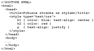 Tento spôsob využijeme v prípadoch, kedy chceme definovať vzhľad len jednej stránky a neplánujeme použitie štýlov na ďalších stránkach. Štýl sa vkladá do záhlavia dokumentu do elementu <style>. Pomocou atribútu